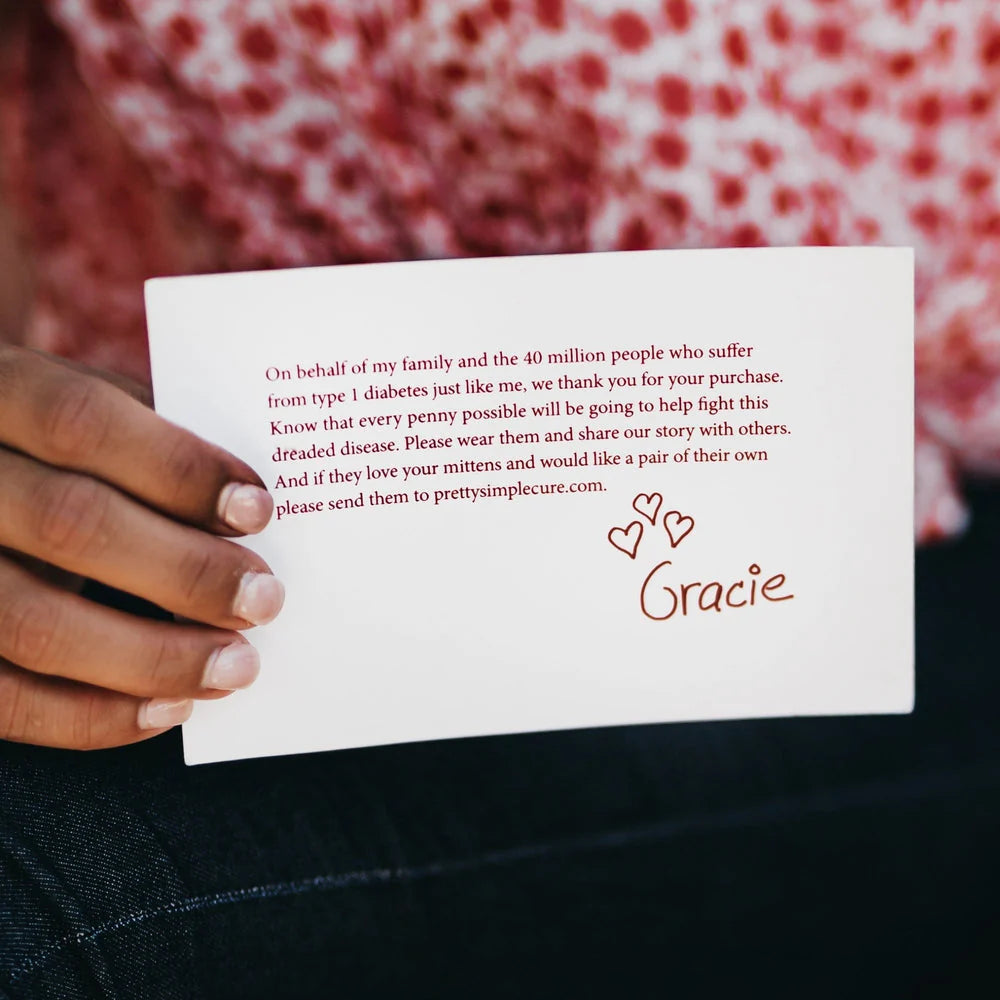 Our CURE Mittens are designed in crazy colors to start a conversation around type 1 diabetes and raise necessary dollars to help fund research to find a cure. We donate every penny possible from the sales of these mittens back to the type 1 diabetes community. The mittens also come in a reusable canister that can be used as a piggy bank. We hope you will continue collecting your spare change as an ongoing donation to help find a cure for type 1 diabetes or share it with someone else in need. Diabetes sucks. It's time to find a CURE. One pair of mittens at a time.