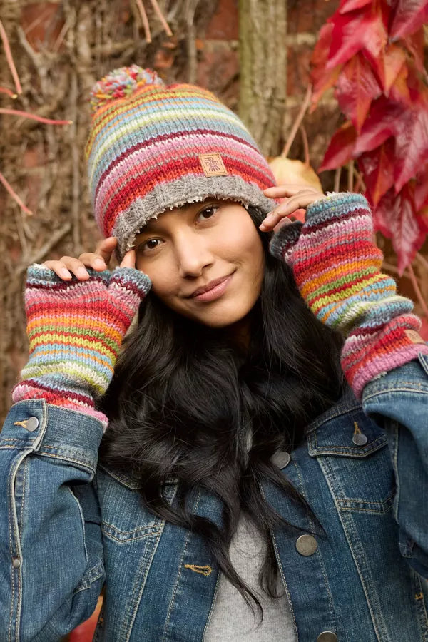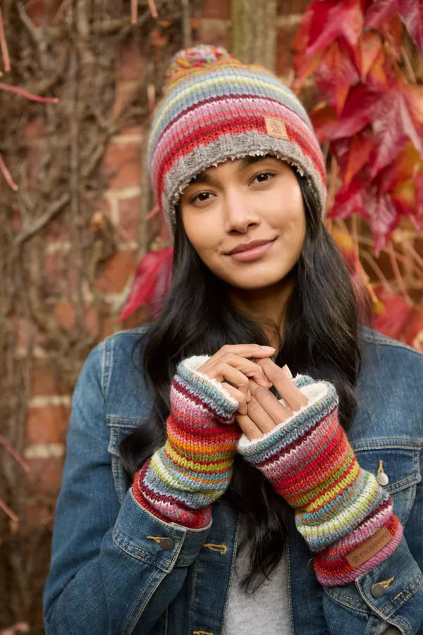Pachamama women's hand knitted wool fingerless gloves, with sherpa fleece lining and colourful rainbow stripes, fair trade and handmade in Nepal.